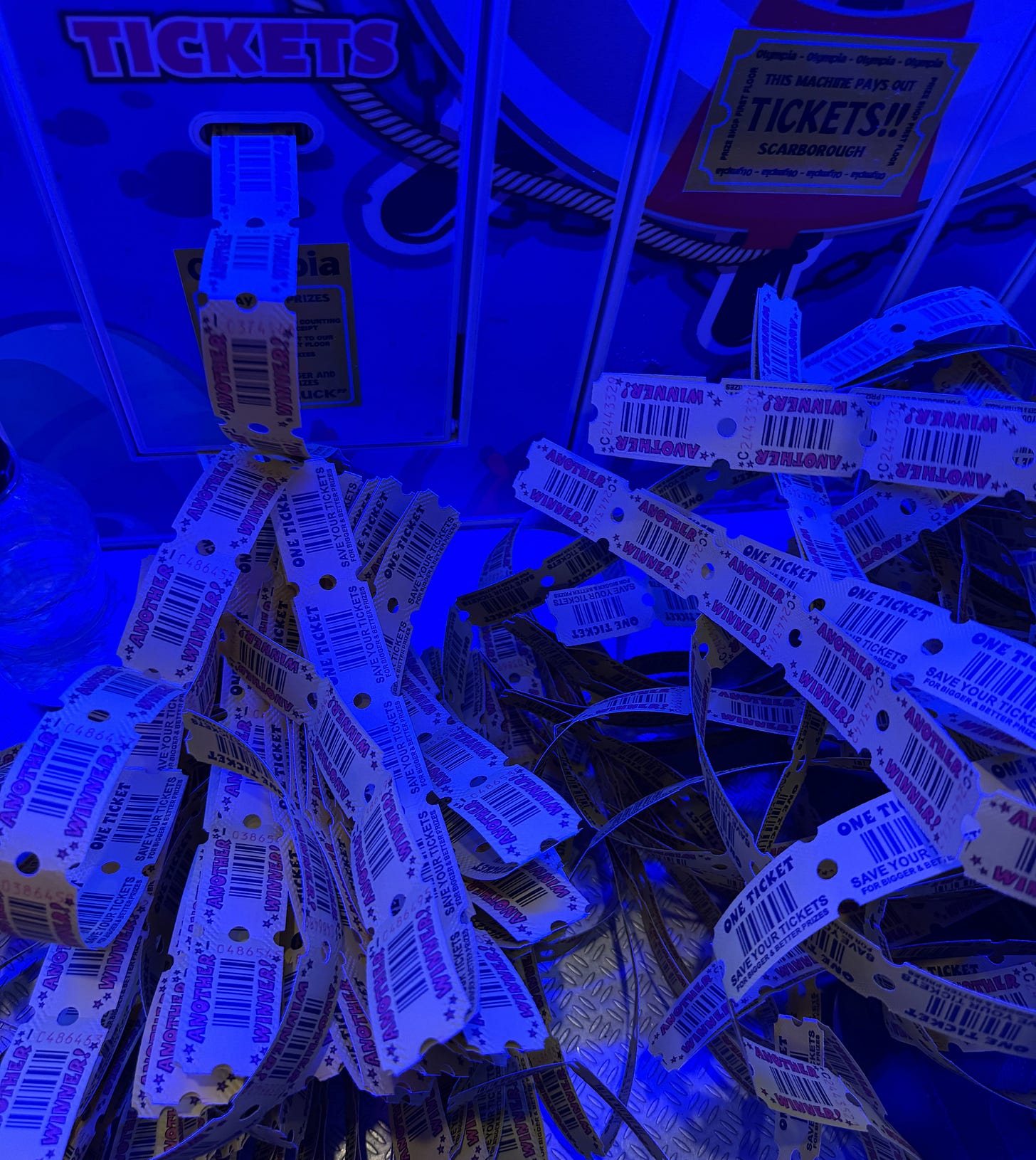Watching 500 golden tickets spew out of the machine at our feet was hilarious. With all the bleeping and strobing from the machine announcing our winnings, we’d made ourselves very conspicuous to the few characters loitering in the arcade as well as the teenage boys who work there, potently over perfumed with thick aftershave that assaulted us as they came to refill the machine: yes, we won so many tickets the machine needed refilling.