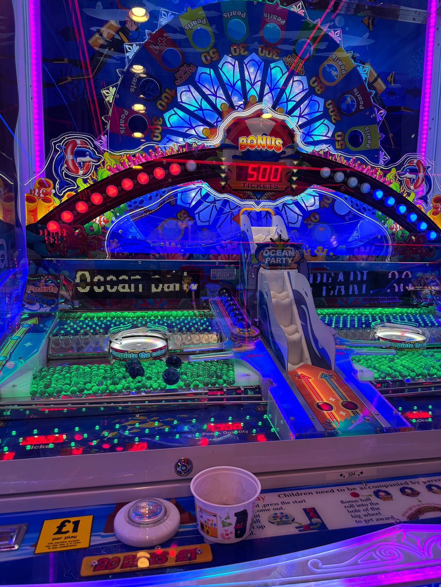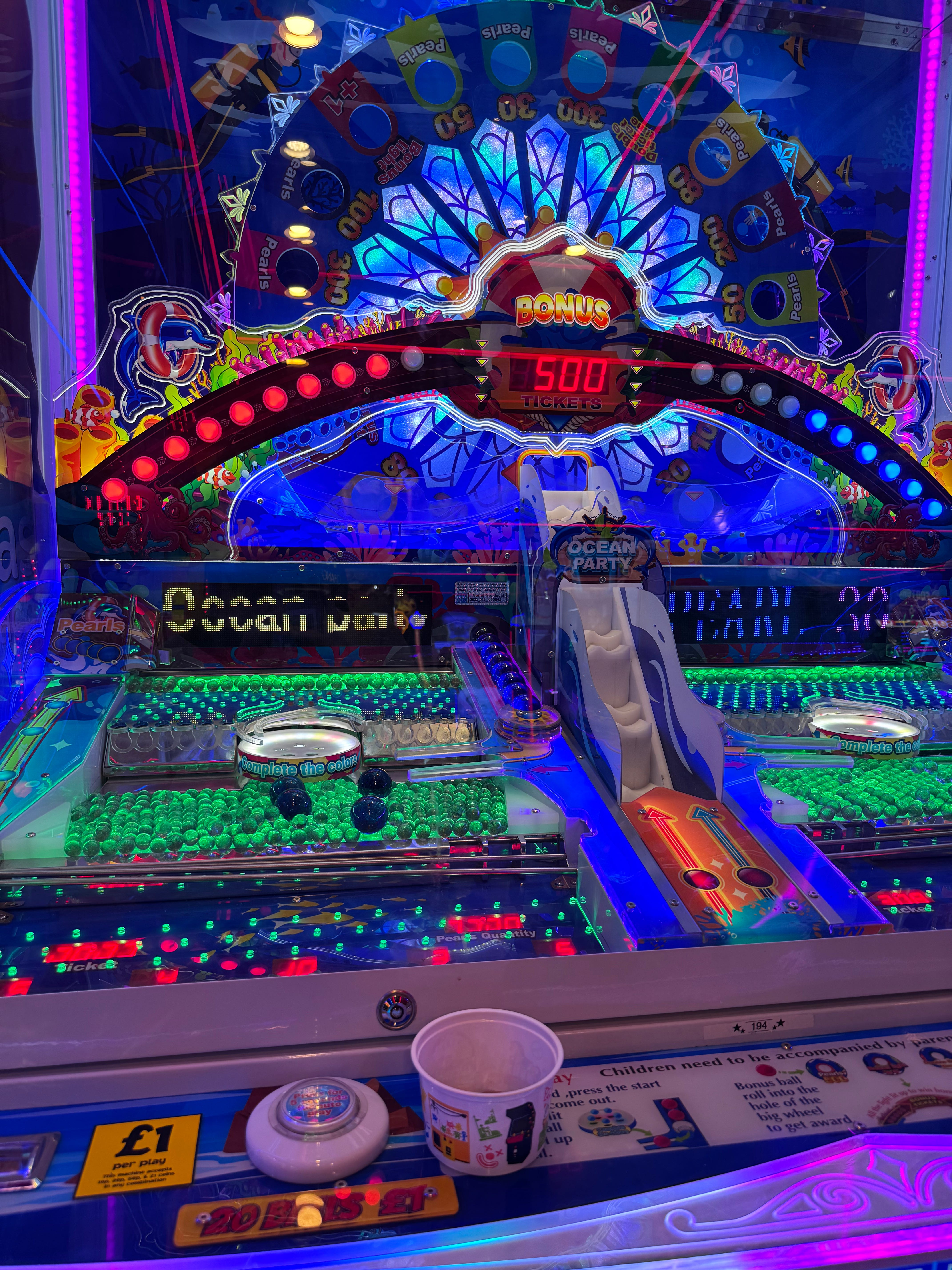 We took up residence at a game of unexpected complexity for an arcade. To win big on the Ocean Party, you have to fire small glass pearls onto a moving tray to push them onto a central disc. Once you’ve dropped a pearl into all five coloured holes in the disc, a big blue pearl is released onto the lower tray. Once that has fallen off the edge, it’s scooped up into a central lift and dropped through a big spinning wheel.